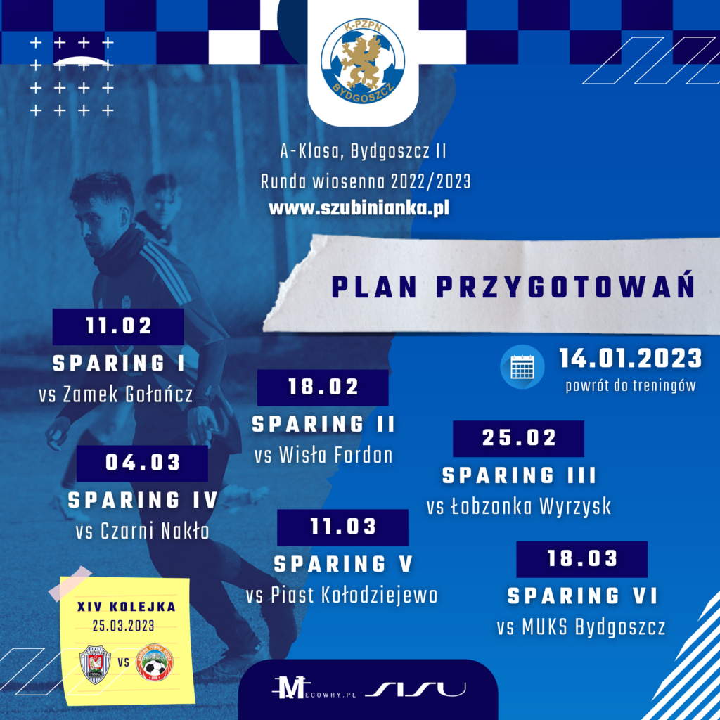 Przypomnijmy, że na półmetku sezonu 2022/2023 „biało-niebiescy” znajdują się dopiero na dziewiątym miejscu w tabeli z dorobkiem 16 punktów. Podczas przerwy zimowej trener szubińskiej drużyny zaplanował sześć meczów sprawdzających dyspozycję swoich podopiecznych przed wznowieniem rozgrywek ligowych. Pierwszy mecz rewanżowy odbędzie się w Szubinie i zaplanowany jest na 25 marca, kiedy to w ramach czternastej kolejki rozgrywek gospodarze podejmować będą Akademię Futbolu Brzoza.