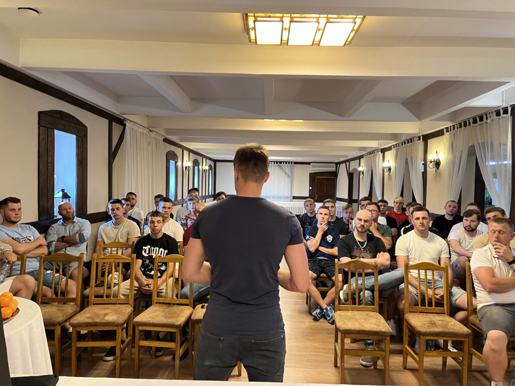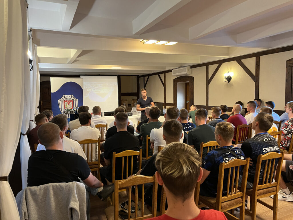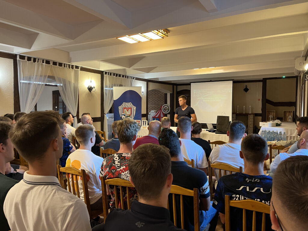 W czwartek (6 lipca) w Pensjonacie Stary Browar odbyło się spotkanie organizacyjne dla zawodników drużyny seniorów. Prezes Mikołaj Kalinowski oficjalnie zaprezentował piłkarzom nowego trenera – Wojciecha Mielcarka. Nowy szkoleniowiec „biało-niebieskich” przedstawił swoim podopiecznym plan przygotowań do sezonu 2023/2024.